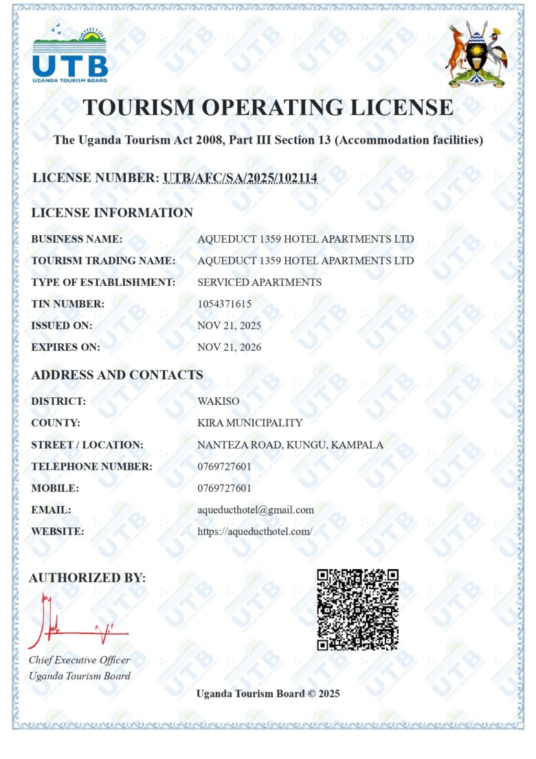 Nestled in Kungu, the peaceful residential neighborhood of Kampala, just minutes from the vibrant pulse of Uganda’s capital, Aqueduct 1359 Hotel Apartments offers a serene escape with breathtaking views of the city’s skyline. Surrounding the hotel is a lush orchard teeming with tropical fruits, filling the air with the sweet aroma of ripe mangoes, passion fruits, and guavas. It’s an oasis of tranquility, designed for travelers who seek both comfort and purpose.