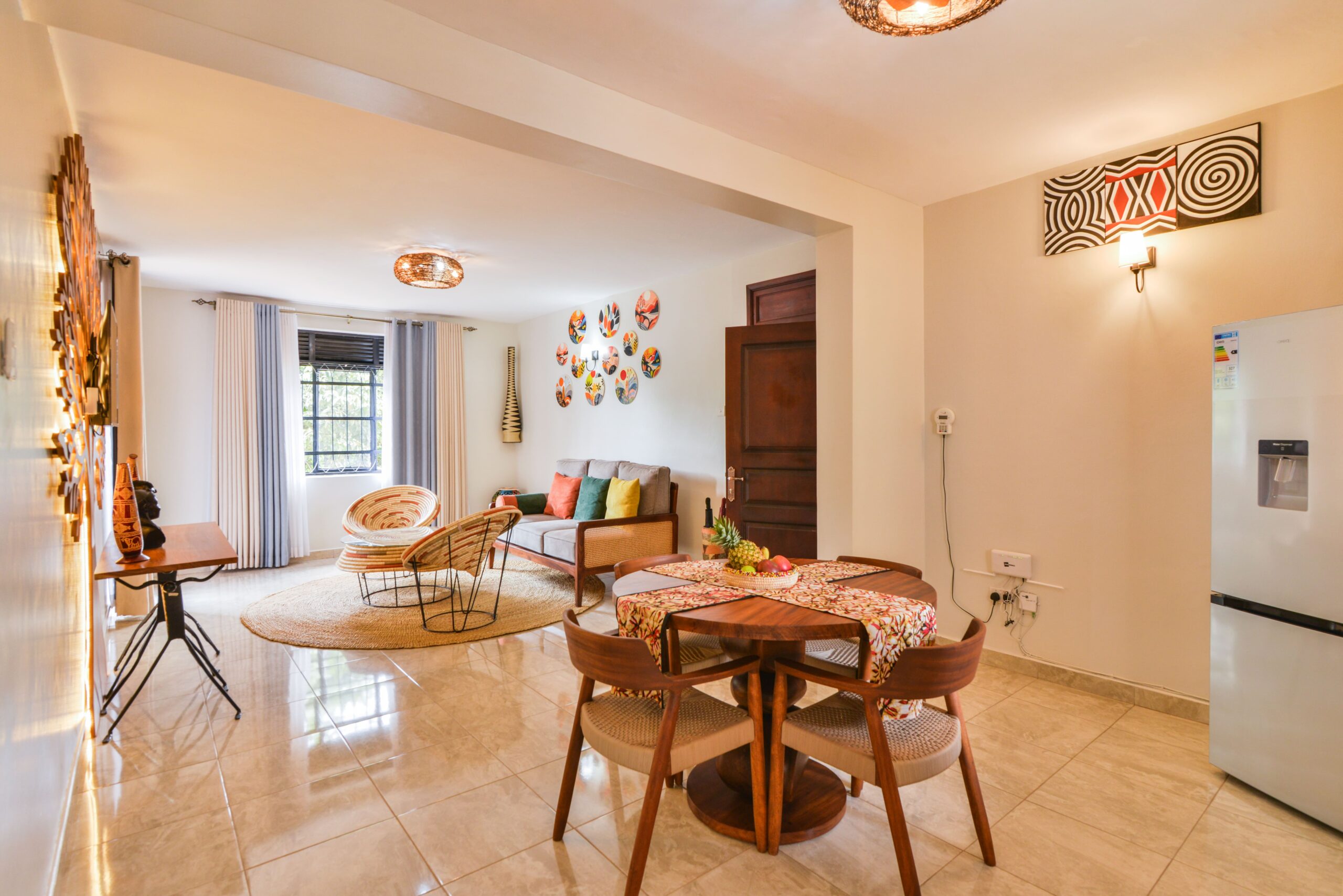 Adjacent to the living area is the dining space, an inviting setting for family meals or hosting guests. It comfortably accommodates a table for six, making it ideal for everyday dining as well as special gatherings.